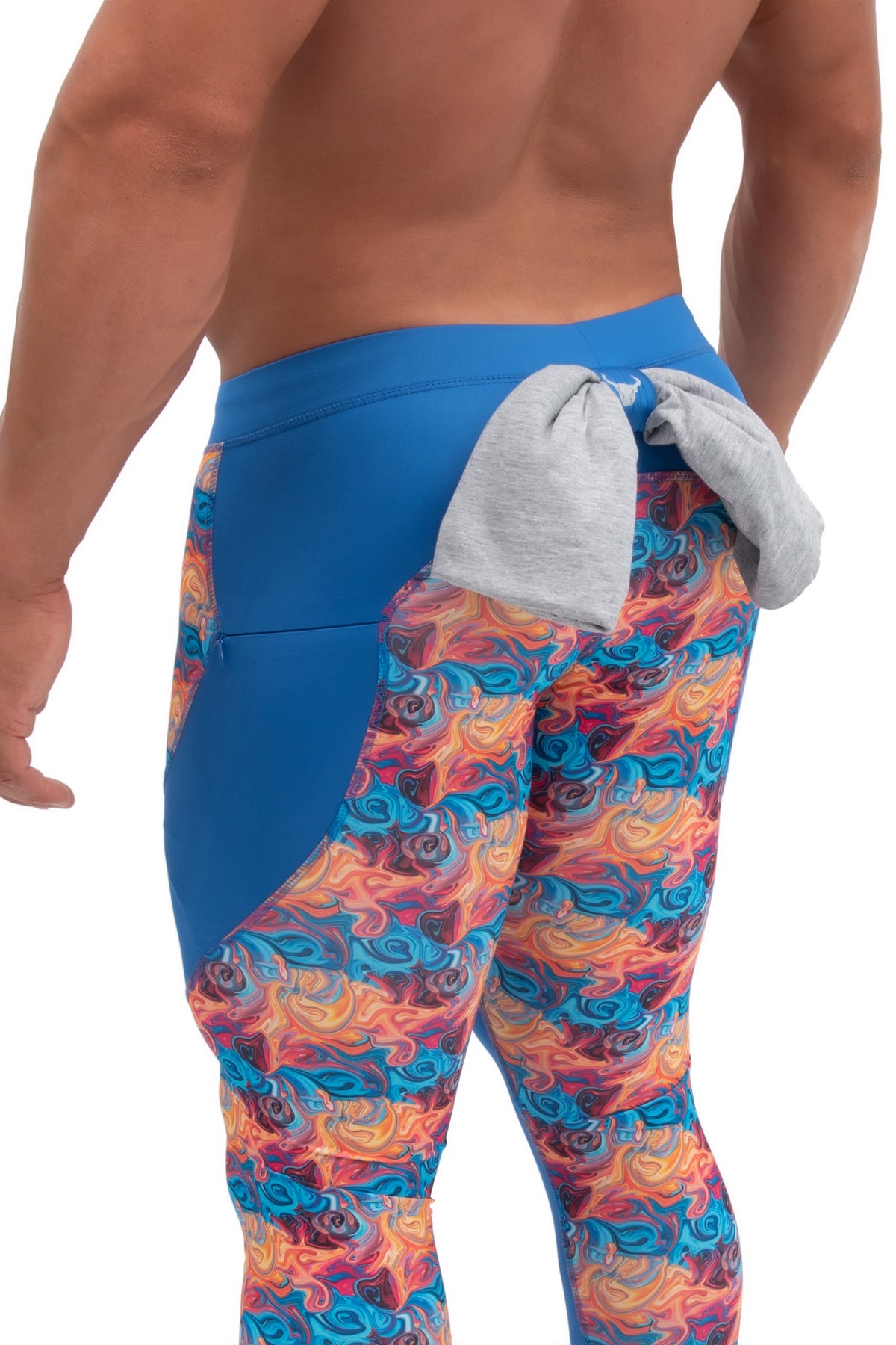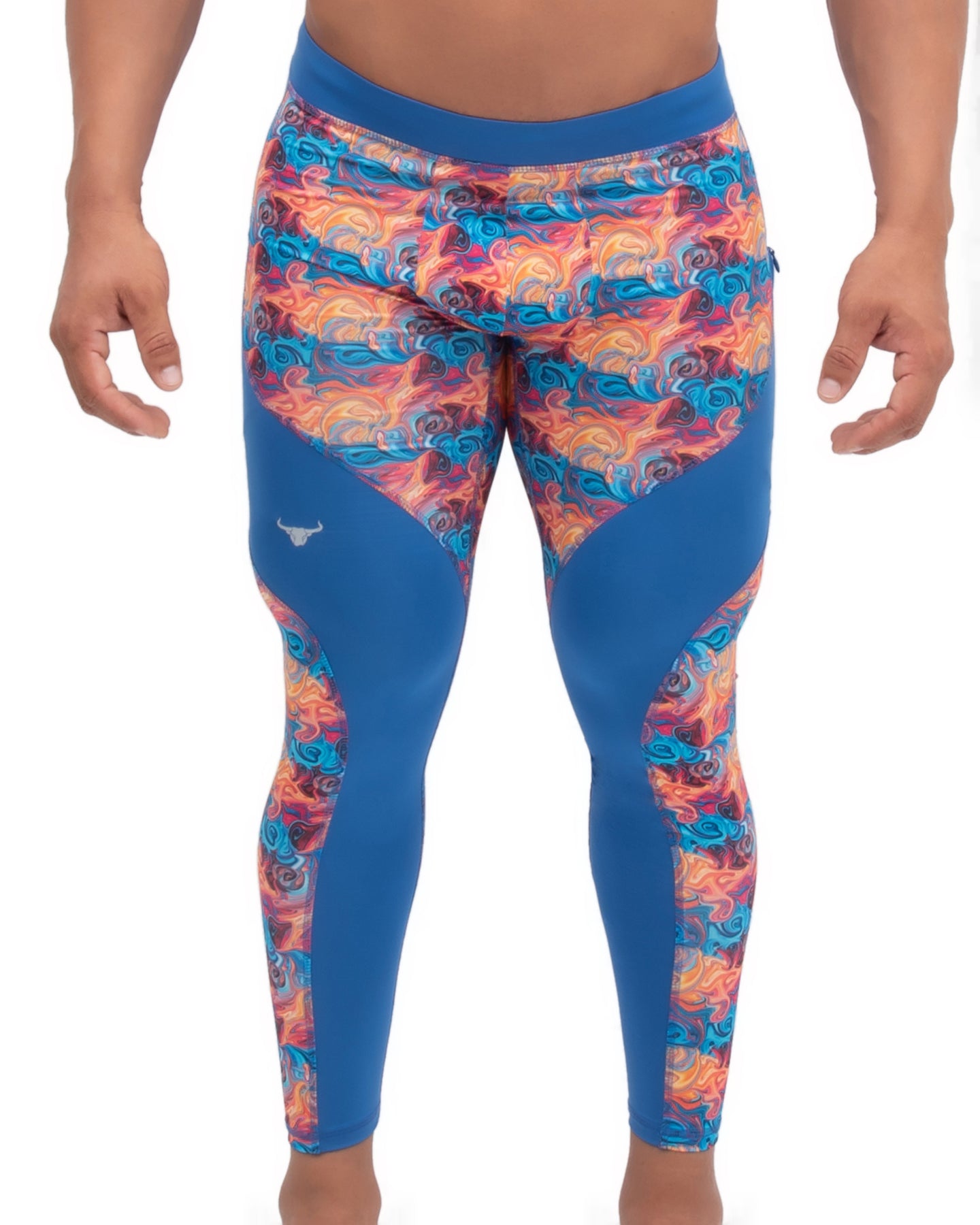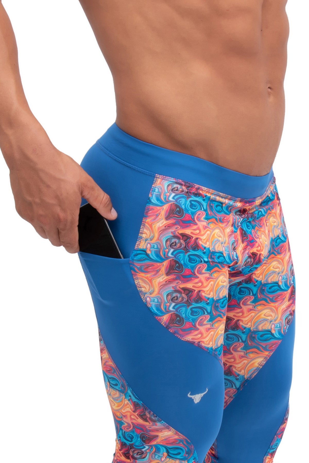 mens leggings | side view of men's blue abstract spandex tights with secure zip pocket