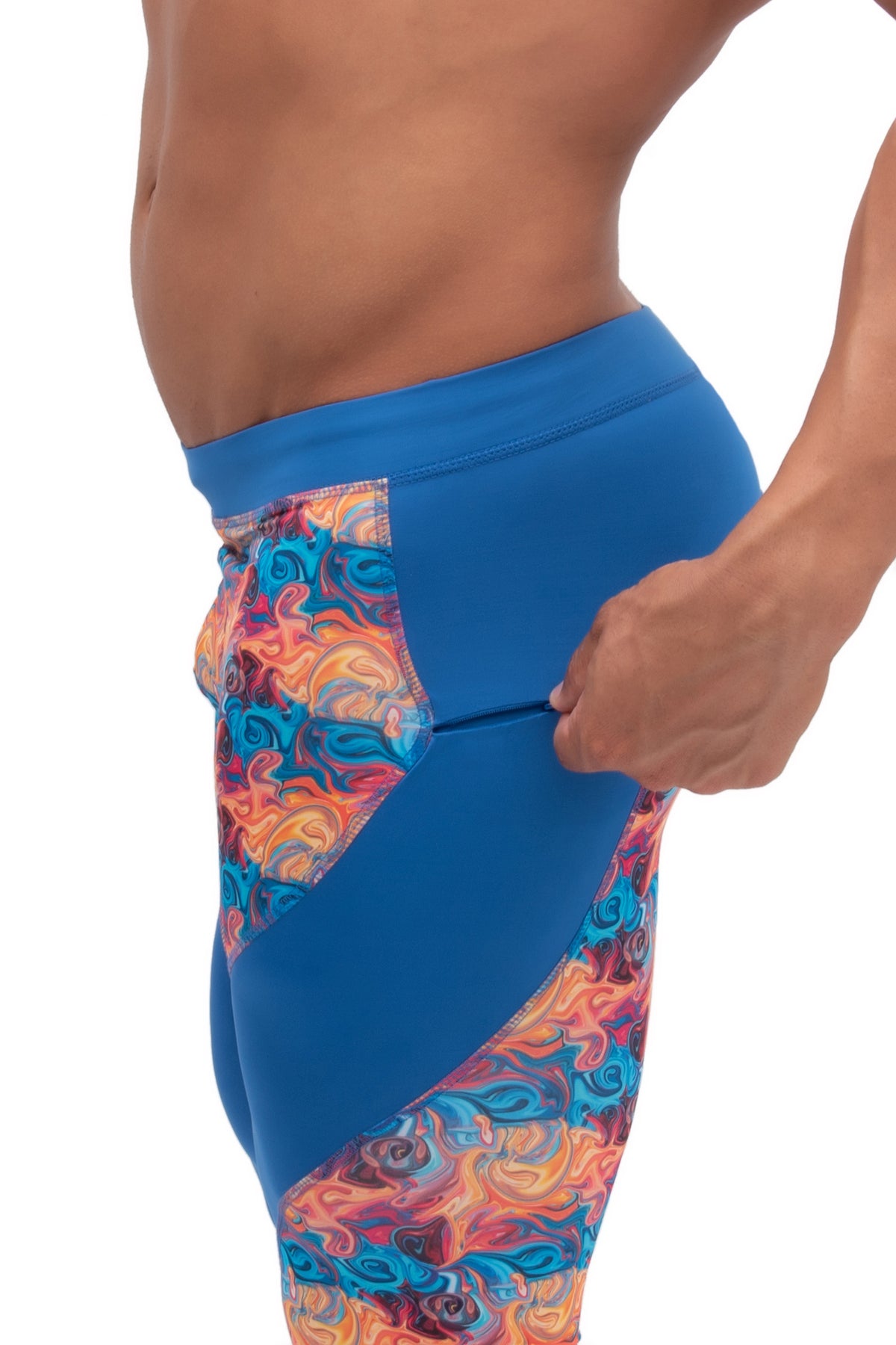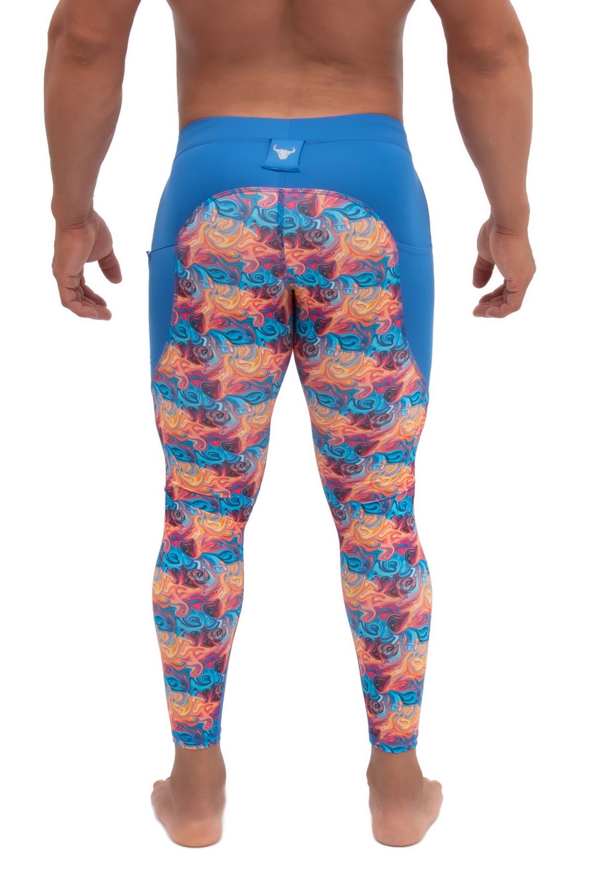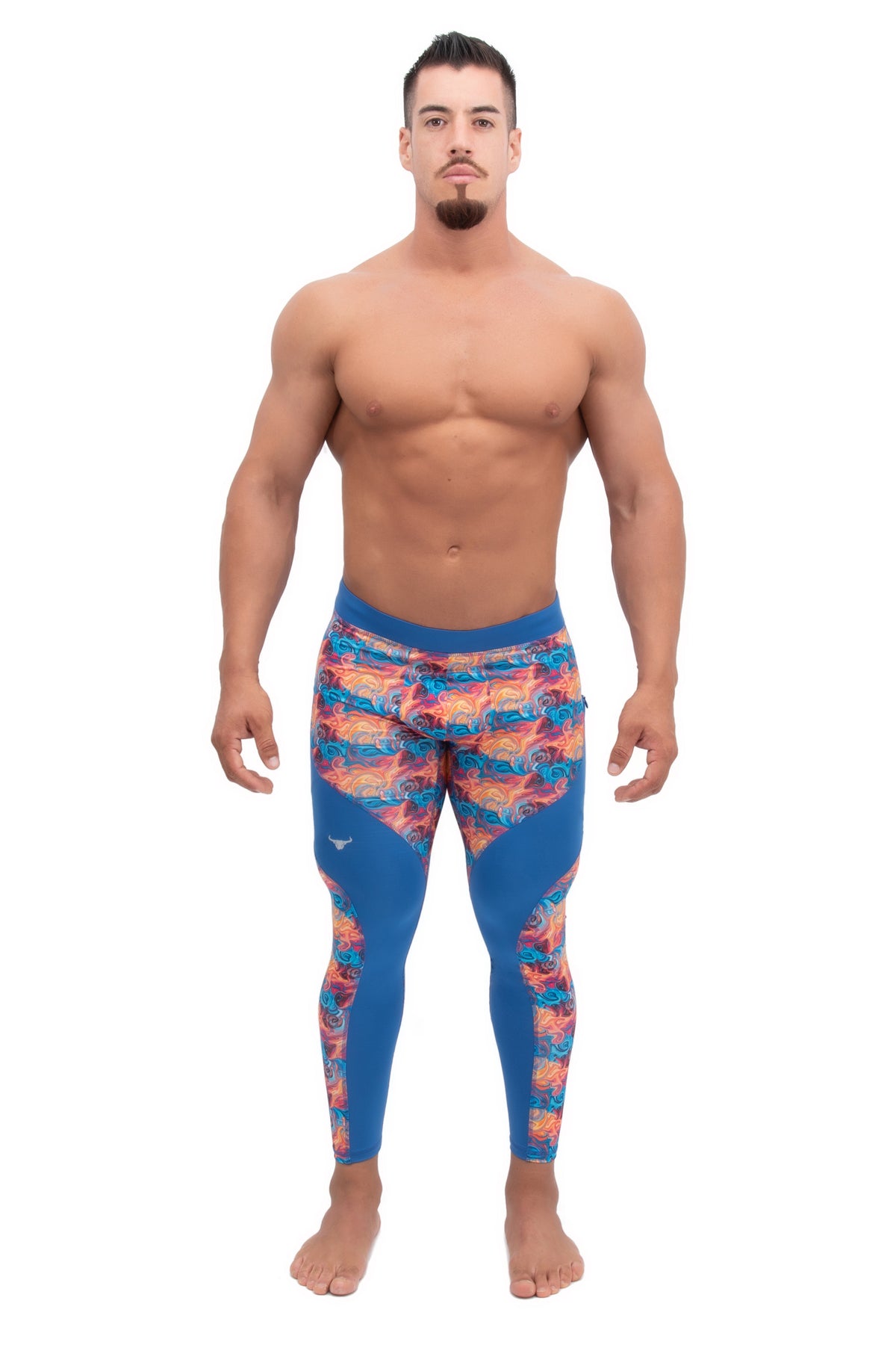 mens leggings | side view of men's blue abstract spandex tights with secure zip pocket