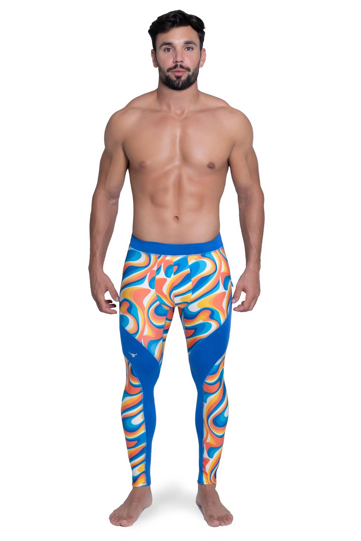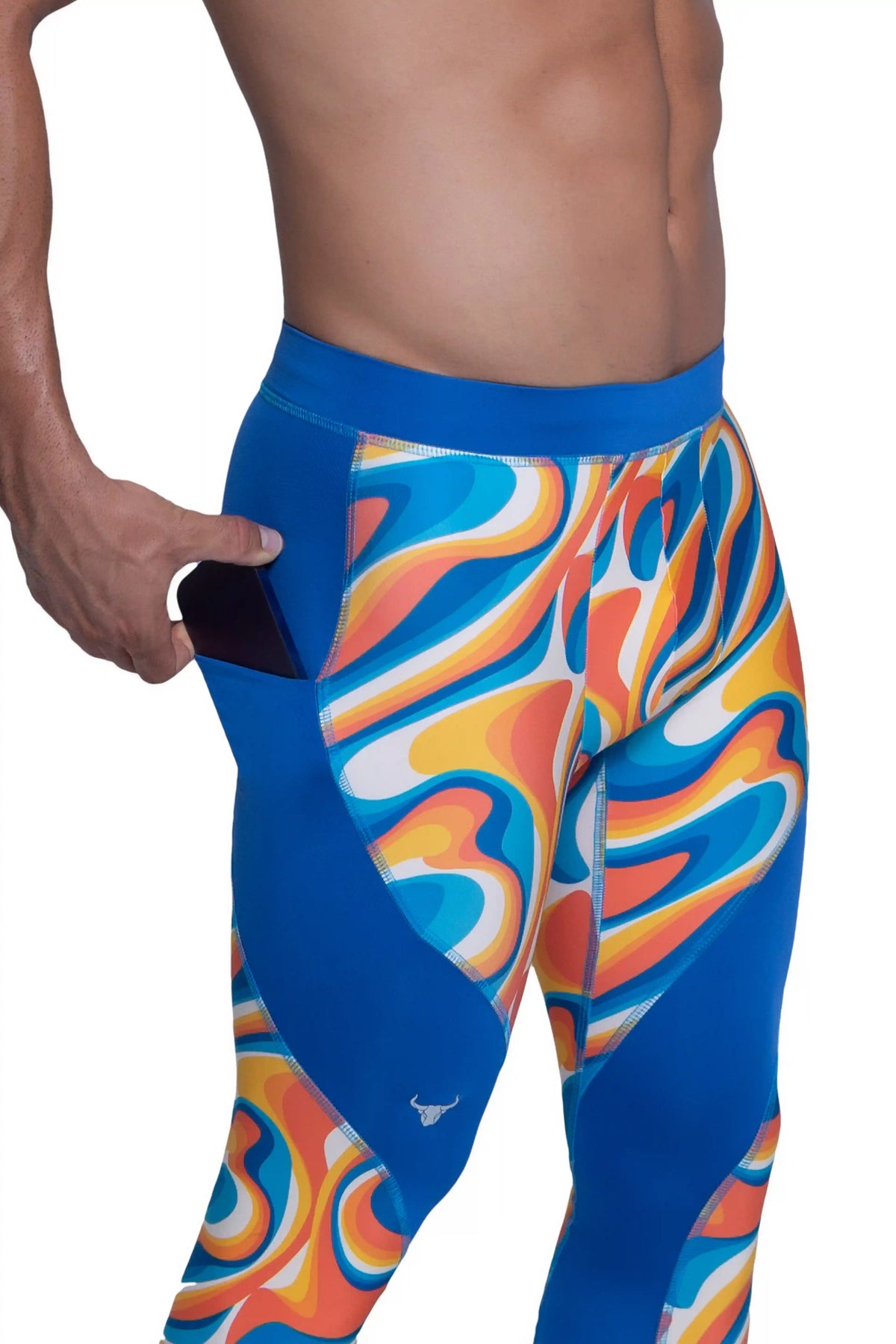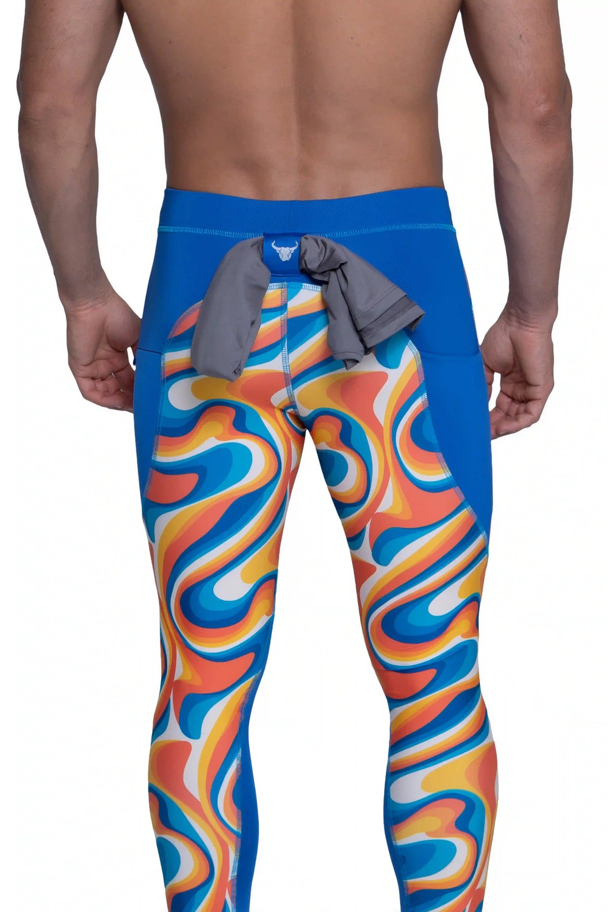 Men's blue leggings with multicolor swirl pattern and towel loop on the back waistband.